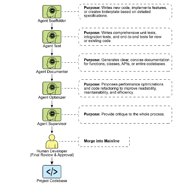 流程编排者:人类开发者: 在此协作框架中,人类开发者承担编排者职能,作为 AI Agent 的中央智能节点与最终权威。