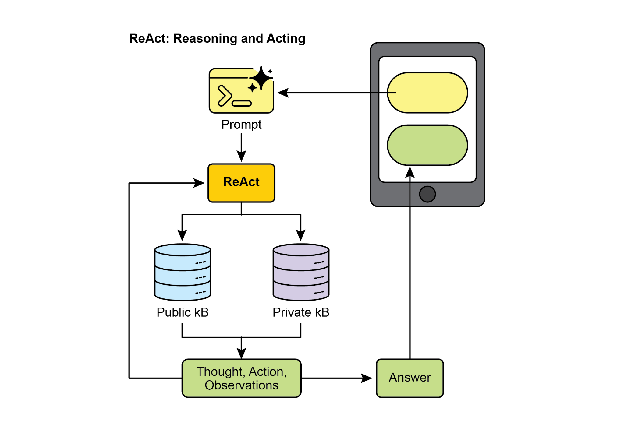 ReAct (推理和行动,见图 3,其中 KB 代表知识库) 是一种将思维链 (CoT) 提示词与 Agent 通过工具与外部环境交互的能力相结合的范式。与直接生成最终答案的生成模型不同,ReAct Agent 首先对要采取哪些行动进行推理。这个推理阶段涉及内部规划过程,类似于 CoT,Agent 确定下一步行动,考虑可用工具并预测可能的结果。然后,Agent 通过执行工具或函数调用来行动,例如查询数据库、执行计算或与 API 交互。