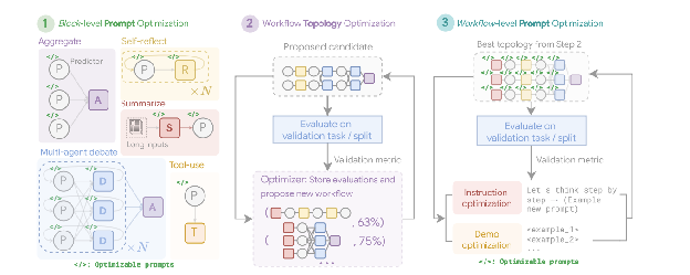 图 4:(由作者提供):多 Agent 系统搜索 (MASS) 框架是一个三阶段优化过程,导航包含可优化提示词 (指令和演示) 和可配置 Agent 构建块 (聚合、反思、辩论、总结和工具使用) 的搜索空间。第一阶段,块级提示词优化,独立优化每个 Agent 模块的提示词。第二阶段,工作流拓扑优化,从影响加权的设计空间中采样有效的系统配置,集成优化的提示词。最后阶段,工作流级提示词优化,在从第二阶段识别出最优工作流后,对整个多 Agent 系统进行第二轮提示词优化。