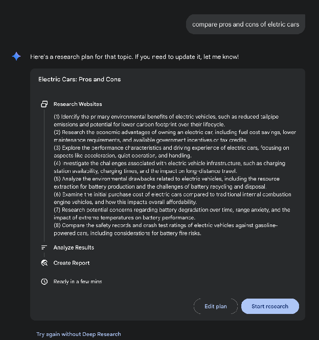 这些工具引入的一个基本转变是搜索过程本身的变化。标准搜索提供即时链接,将综合工作留给用户。Deep Research 采用不同的工作模式。在这里,用户为 AI 分配一个复杂的查询并授予它一个"时间预算"——通常是几分钟。作为这种耐心的回报,用户会收到详细的报告。