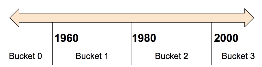 通常情况下,我们不希望直接将数值传入模型,而是根据取值范围将数值放进不同的类别中。可以通过创建 tf.feature_column.bucketized_column 完成上述功能。例如,考虑一组表示房屋建成年份原始数据。我们应该将年份放入 4 个不同的 buckets 中,而不是把每一个年份数值都作为一个标量数值列: