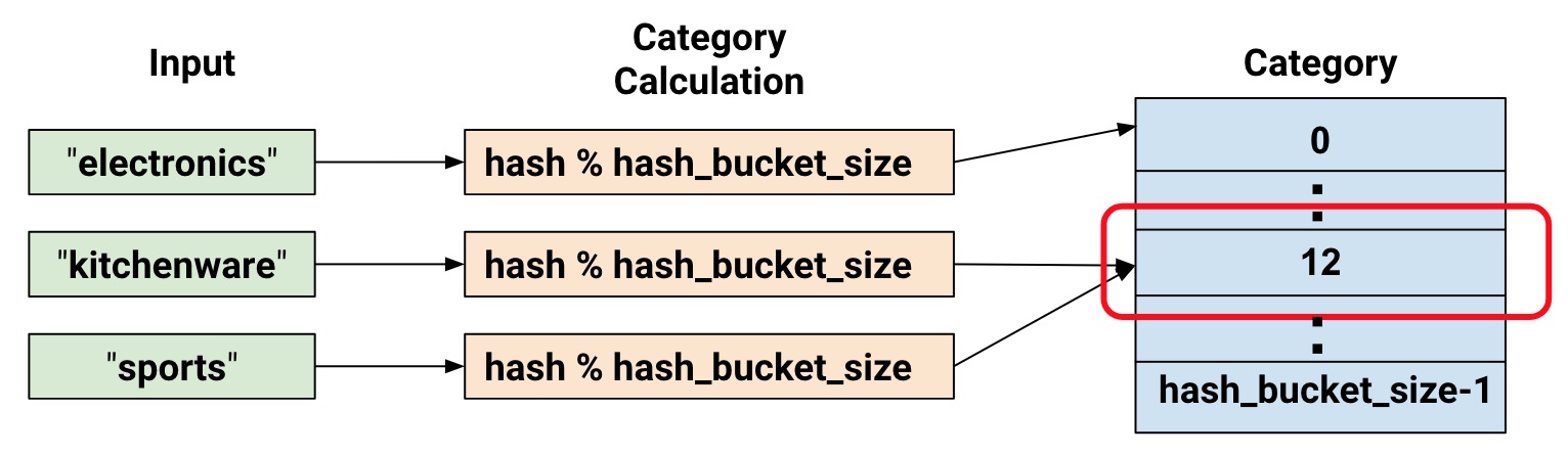 目前为止,我们只讨论了类数目很少的实例。例如,product_class 实例只有三个类目。但是通常情况下,类的数量很大,以至于不可能每一个词或者整数都有一个独立的分类,因为如果这样内存开销将会过大。在这种情况下,我们可以反过来思考这个问题:我愿意将输入分为多少个类别?事实上,tf.feature_column.categorical_column_with_hash_bucket 方法允许你定义分类的数目。对于这种类型的特征列,模型会计算输入的哈希值,然后使用模运算符将这个值放入一个 hash_bucket_size 类中,如下伪代码所示: