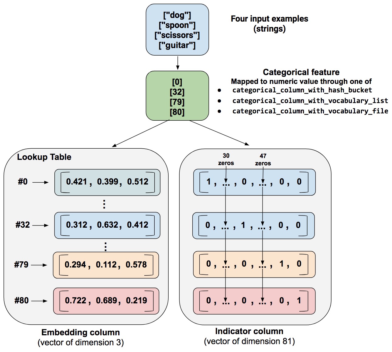 当一个样本被处理时,其中一个 categorical_column_with... 函数将样本字符串映射为数值的分类值。例如,一个方法将“勺子”映射为 [32]。(这里的 32 是我们假想的 - 实际值取决于映射函数。)接下来,你可以用如下两种方式来表示这些数值分类值: