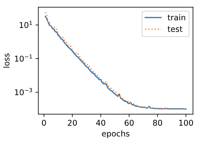 其中噪声项 服从均值为 0、标准差为 0.01 的正态分布。训练数据集和测试数据集的样本数都设为 100。