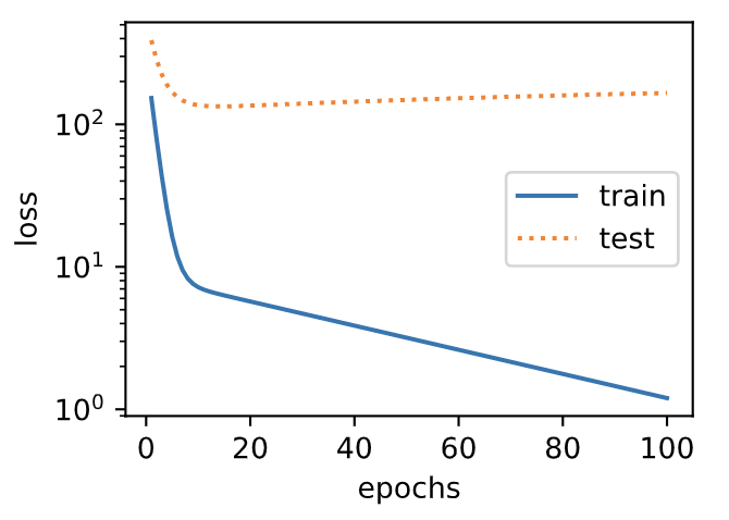 事实上,即便使用与数据生成模型同阶的三阶多项式函数模型,如果训练样本不足,该模型依然容易过拟合。让我们只使用两个样本来训练模型。显然,训练样本过少了,甚至少于模型参数的数量。这使模型显得过于复杂,以至于容易被训练数据中的噪声影响。在迭代过程中,尽管训练误差较低,但是测试数据集上的误差却很高。这是典型的过拟合现象。