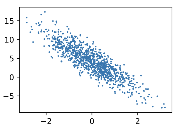 我们构造一个简单的人工训练数据集,它可以使我们能够直观比较学到的参数和真实的模型参数的区别。设训练数据集样本数为 1000,输入个数 (特征数) 为 2。给定随机生成的批量样本特征 ,我们使用线性回归模型真实权重 和偏差 ,以及一个随机噪声项 来生成标签