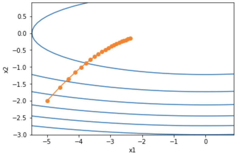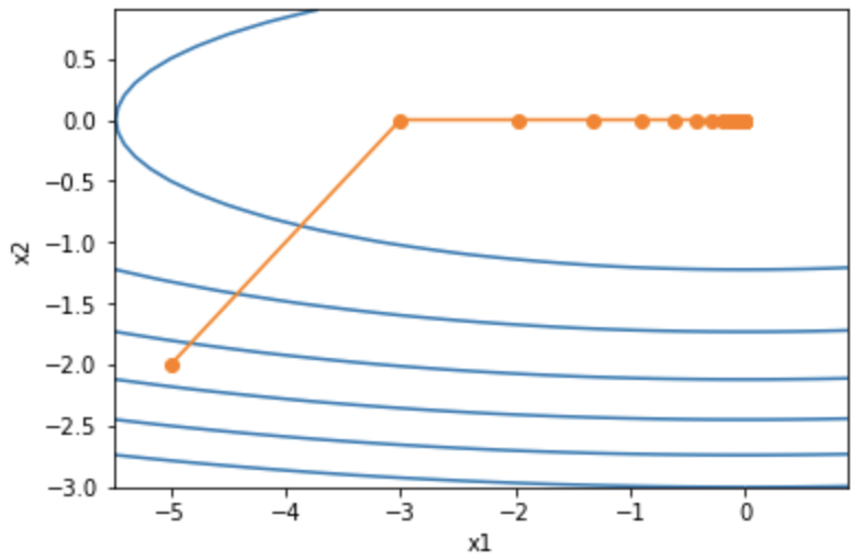 g1, g2, eps = 0.2 * x1, 4 * x2, 1e-6 # 前两项为自变量梯度